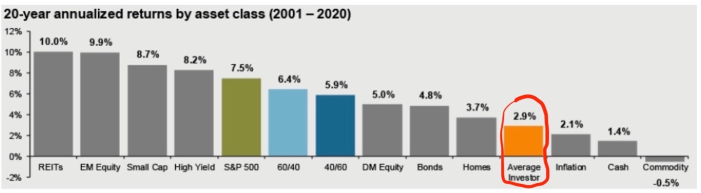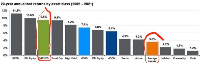 The average investor has earned an average annual return of 3.6% compared to 9.5% for the S&P-500 during a 20-year period from 2002-2021. And that 3.6% return is a ‘nominal’ return, not a ‘real’ return. Inflation, on average, over this period was 2.2%, so the real return was only 1.4%.