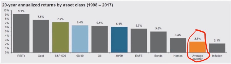 Stocks as a whole have fared very well compared to other asset classes. The return on the S&P-500 has outpaced bonds, homes, commodities and others, over long stretches of time. Yet, the average investor has done poorly. Take a look: